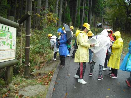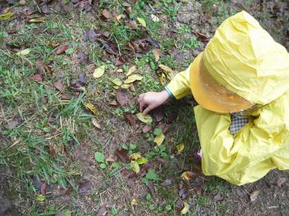 雨はやんだり霧雨が降ったりですが,ネイチャービンゴの活動を行いました。自然にあるものを見つけてカードにチェックしていきます。木の実や虫,鳥の鳴き声・・・。グループで歩いて見つけていました。何かが見つかるたびに歓声があがっていました。