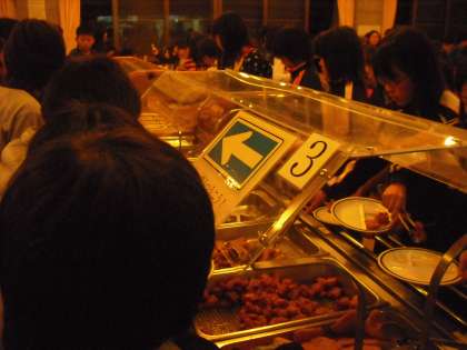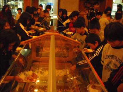 おなかを減らして食事に行きました。バイキング形式でおいしそうに食べていました。おかわりする子もたくさんいました。グループごとに集まって食べました。
