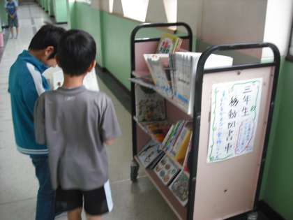 3年生の廊下に、移動図書車が現れました。国語の「すがたをかえる大豆」の学習の一つとして、移動図書車には「すがたをかえる、食べ物シリーズ」がのっています。足を止めて読んでいる子どもも多く、移動図書車は人気者です☆