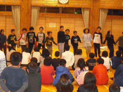 プレイホール(体育館)にみんなが集まって集会をしました。はじめは校歌やキャンプファイヤーの歌の練習をしました。きれいに歌っていました。次にみんなで楽しめるゲームをいくつかやりました。楽しく過ごしました。