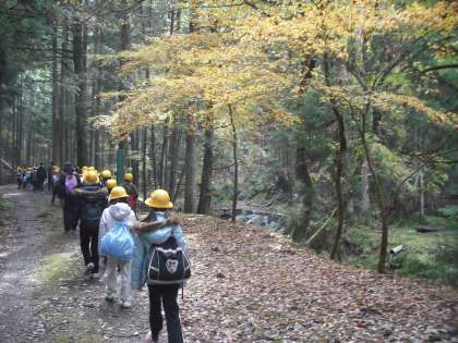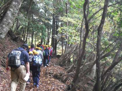 交流の森までバスで15分かかりました。そこで集まってクラスごとに出発です。インストラクターの方の先導で,ボーイスカウトの応援もいただき安全に気をつけて登り始めました。