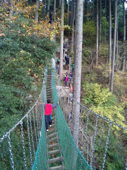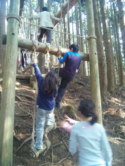 雨で延期になっていたフィールドアスレチックの活動を今日行いました。冒険の森です。みんな、悪戦苦闘をしながらも普段やったことのない遊具なのですごく楽しんでいます。