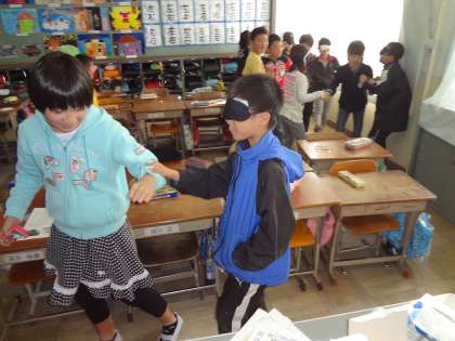 4年生は総合的な学習で身体の障害について学習しています。その一つとしてアイマスク体験をしました。誘導の仕方や指示の出し方など難しいことがすごくわかりました。