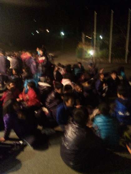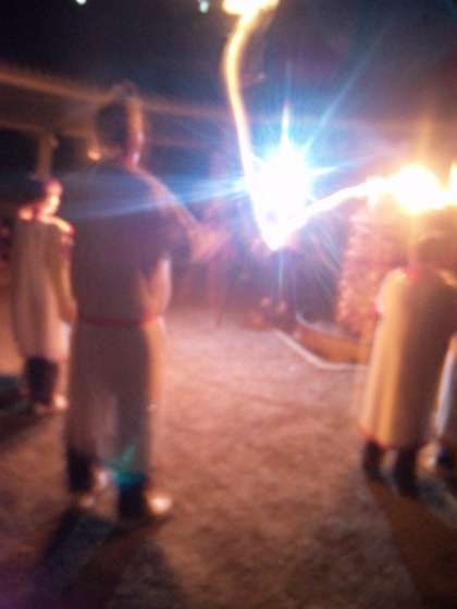 いよいよキャンプファイアーの時間です。待ちに待った子ども達のテンションは、すごく上がっています!!火がもっと強くなるように「燃えろよ燃えろ」を歌いました。1組の出し物がトップバッターです☆非常に盛り上がってます♪