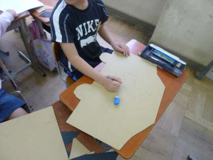 図工「ひかりのおくりもの」で、ダンボールのまわりを切り