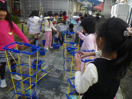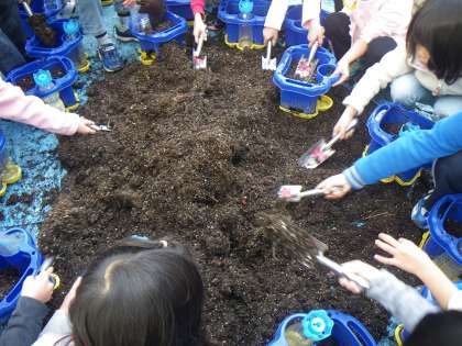 あさがおを育てていた植木鉢に,チューリップの球根を植えました。