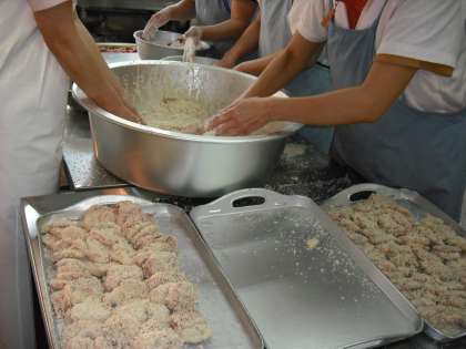 今日はヒレカツでした。給食室は一年で一番忙しい日です。豚肉に小麦粉・卵・パン粉を付けて油で揚げます。いったい何枚のヒレカツを作ったのでしょう???