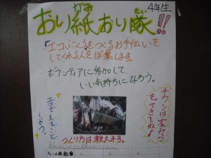 明日は,4年生と1年生を中心にエコ袋を作る「おり紙折りたい」の募集をしています♪みんなで楽しくできますよ☆