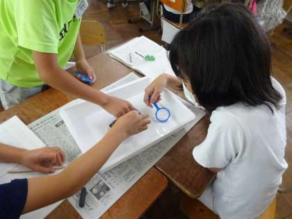 理科の学習で、水は土にしみこむのかを考えました。運動場の土と砂の粒の大きさを比べたり、水をかけてその土の様子を観察したりしました。