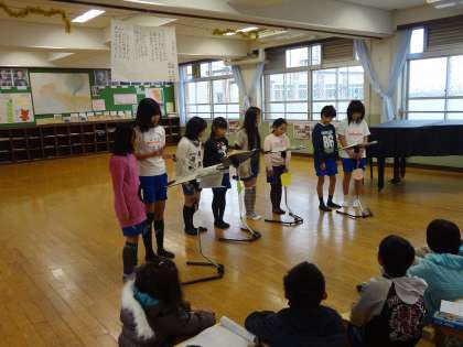 音楽で練習していたアンサンブルを発表しました。練習の成果があって,きれいにできていました。振り付けもあってよかったです。