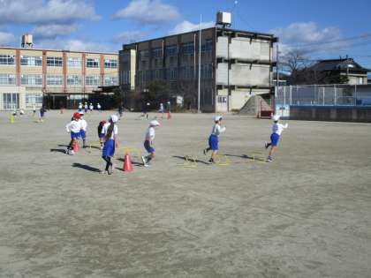体育科「とびくらべ」の学習です。「リズムよく飛ぶにはどうしたらいいか。」「遠くまでとぶには,片足ジャンプをするか両足ジャンプにするか。」など,話し合いながら場の設定を変えています。