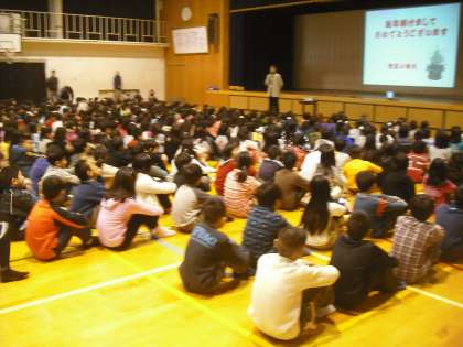 今日の昼休みに全校生徒で体育館に集まり,「始まりの会」というのをしました!