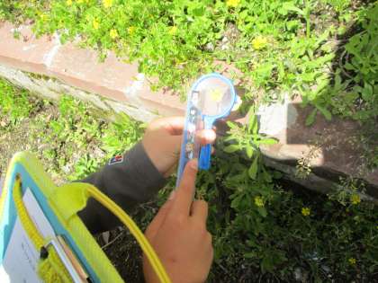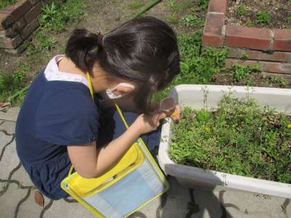 理科の学習では、「観察」の学習をしています。虫メガネを使って、細かいところまで観察をします。長さをはかったり、メモをしたりと、生き物博士になった気分です。