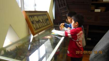 樫原小学校の郷土資料館には,昔の道具がたくさん展示されています。