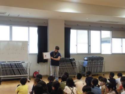 新沢としひこさんの『ともだちいっぱい』という本でした。みんな静かに聞き入っていました。図書委員さんもお手伝いに来ていました!終わりにお土産ももらったようでしたよ!読み聞かせはまだまだ続きます。