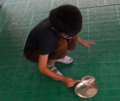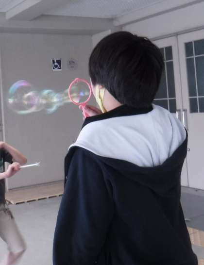 高学年のお兄さんやお姉さんがそうっと息を吹きかけると、とても大きなシャボン玉ができました。みんなそれを見て大喜び。何個も大きいシャボン玉を作ってもらっていました。