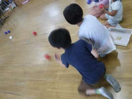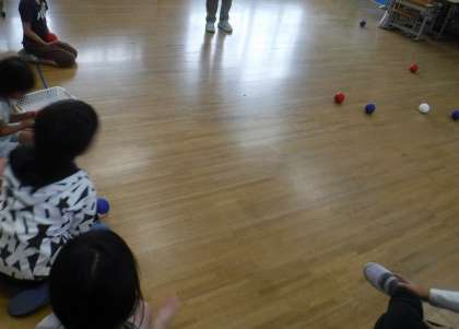 かしのみ学級のみんなも、強く投げたりそっと投げたりして、工夫して楽しんでいます。お友達が上手に転がしてびっくりしたり、ボールをはじく作戦を考えたお友達に拍手をしたり。