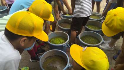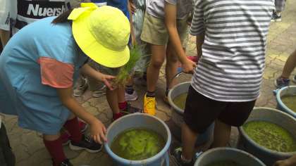 代掻き(しろかき)を終え、バケツの中に稲をうえました。
