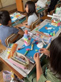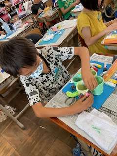 空き容器に紙粘土をつけて貯金箱や小物入れなど