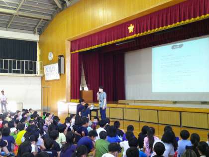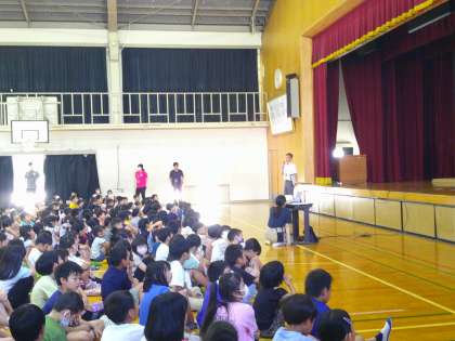 その次に山名先生が7月のなかよしの日の紹介で、「あおいらくだ」という絵本を読んでくださいました。「ちがい」についてを考えました。各クラスでさらに深めていきます。