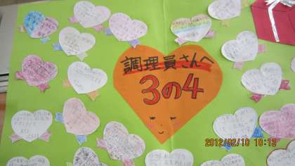 今週は給食感謝週間でした。今日は給食調理委員さんに感謝の気持ちをみんなで書きまとめ,贈りました。代表の子が,調理員さんに「3年4組です。いつもおいしい給食をありがとうございます。」と渡してくれました。「ありがとう」とお返事をもらってとっても嬉しい瞬間でした。