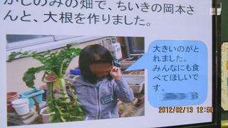 かしのみ学級さんから,畑で丹精こめて作ったお大根をいただきました。おいしく炊いてあり,給食のおかずも大根煮もよく食べました。おいしい交流にみんな大感激!教室に話しに来てくれたYちゃんの話し方も上手で,「ありがとう」の大きな拍手がわきました。