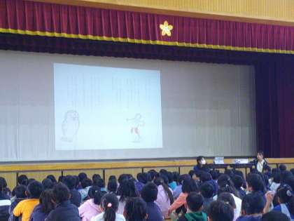 樫原小学校でも、人権朝会を行いました。初めに校長先生から12月のKSKつながりプロジェクトのテーマ「思いやり」のお話をしてくださいました。次に、人権部から「人権」についてのお話と、絵本の読み聞かせがありました。『ねずみくんのきもち』というお話でした。