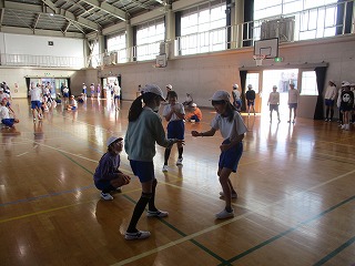 3組は「王様とり」を企画・運営しました。偶数チームと奇数チームに分かれて、相手のチームの王様を捕まえたり、捕まった味方を王様が助けるなど、お互いに声をかけあうコミュニケーションを意識した活動になりました。