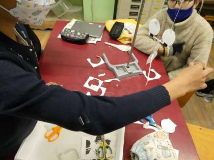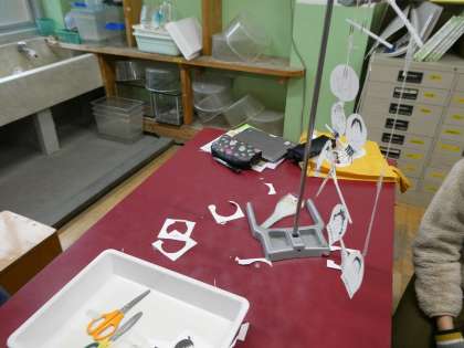 モビールを作りました。大きさや重さのの違う絵をうまく