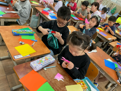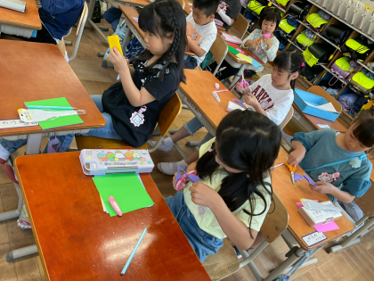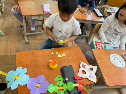 はさみの練習後、折り紙を切って