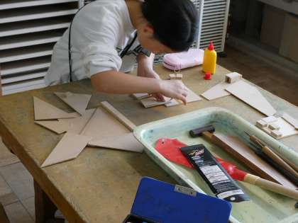切った木材をボンドで貼り合わせて、形を作っています。