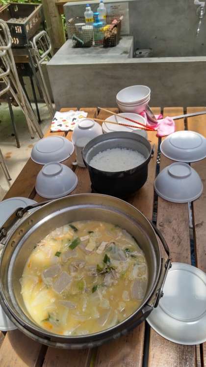 豚汁が出来上がり、ご飯も炊きあがりました。とても美味しそうです。