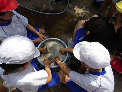 そこに水を入れます。班の全員でバケツの中に入っている