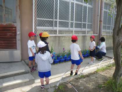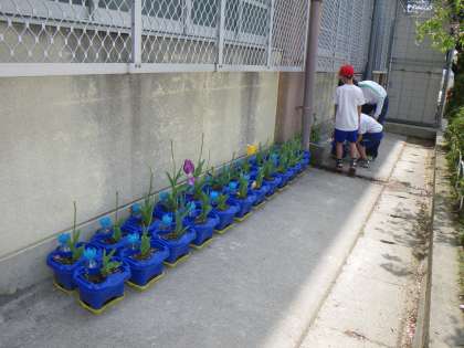 2年生が,1年生の時から育てているチューリップの植木鉢をを東校舎の近くに移動させました。