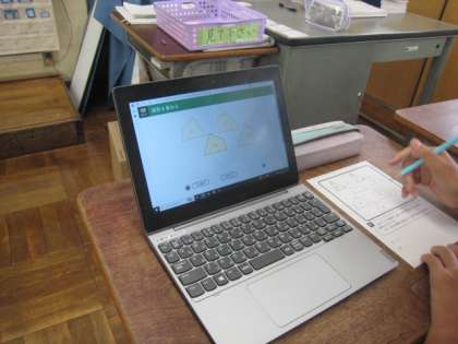 ぴったり重なり合う図形を見つけるために、長さや角の大きさを測ったり、パソコン上で実際に重ねてみたりしました。