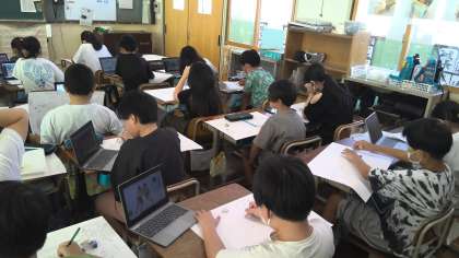 お話の絵は、下書きをしています。大きな画用紙に書くときは、主人公の姿の大きさをどうするか、画用紙のどこに置いたらいいかを考えています。難しいポーズや表情は、タブレットで調べています。