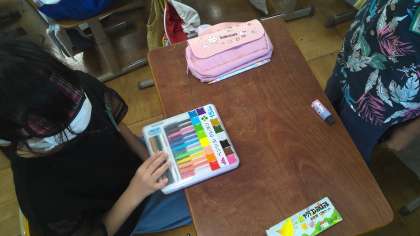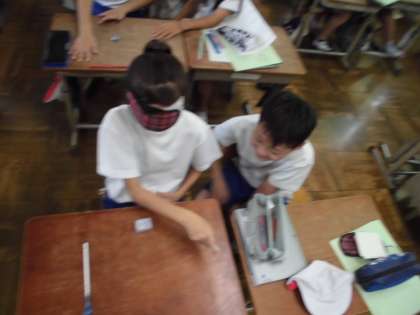 子ども達は文房具を代わりに使って、体験をしました。