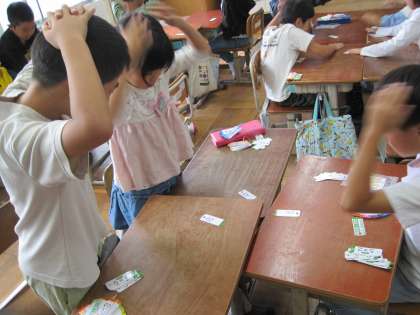 九九の学習を進めています。一人で唱えたりペアで問題を出し合ったり、グループで九九カルタをしたりするなど、しっかり覚えられるようにいろいろなパターンで繰り返し練習しています。