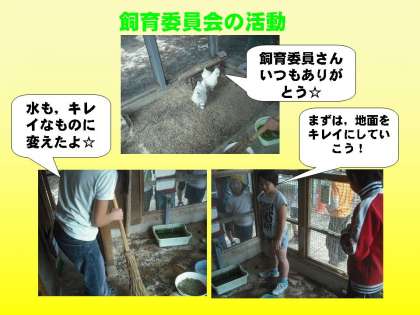 今日の昼休みに飼育小屋をのぞきにいくと,5年生の飼育委員会の子ども達がいまし!フンの掃除,水を変える,などなどうさぎ小屋,鳥骨鶏の小屋をキレイにしてくれました!うさぎも,鳥骨鶏も喜んでいるでしょうね♪