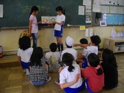 今日の天気は雨でした。子どもたちの多くは外で遊びたくてウズウズしている模様でした。そんな中,図書係が読み聞かせをしてくれました。図書係が中間休みに「どれを読んでほしい?」と絵本3冊を紹介して,昼休みにそのうちの1冊を読み聞かせしてくれました。本は,「ちゃんとたべなさい」という題名でとてもユニークでおもしろいお話でした。前回は「こんたくんのえーとえーと」でした。図書係のがんばりに心打たれました。