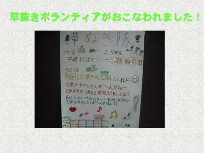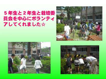 今日のお昼休みのワクワクタイムでは,ボランティア委員会が計画した草抜きボランティアがありました!また,草抜きということで栽培委員会も参加させていただきました!今回は,5年生と2年生を中心にボランティアの活動をしたのですが,たくさんお学年が協力してくれました!「何やってるの?私もやりたい!」という感じでどんどん人が増えていきました!暑かったのですが,みんな楽しく取り組んでくれました☆