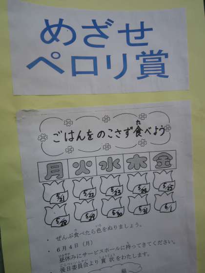 給食委員会では,残りがちな「ごはん」をペロリと食べてもらおうと「ペロリ賞」を計画しました。クラスのごはんが空っぽになった日は,もらった台紙に色を塗ります。全部達成できるとその月は賞状がもらえます。子どもたちの活動の中で「もったいない」の気持ちを育ててくれたらと思います。