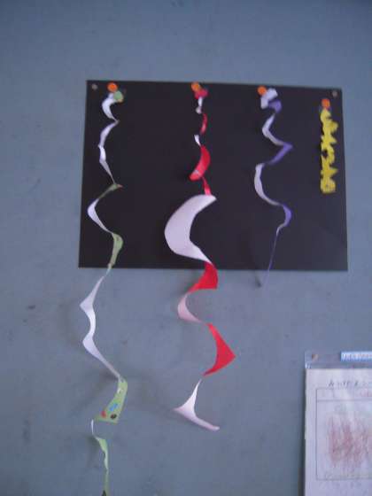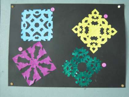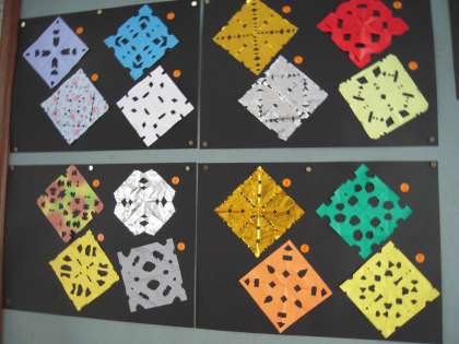 図工の時間にはさみと折り紙を使って,かざり作りをしました。初めに,はさみを使うときの約束を考えました。その後,折り紙を切ってなが〜いかざりを作り,友達とくらべっこをして楽しみました。次に,紙を折って切り取ってそっと開けると… 「わあっ!」と歓声が上がり,すてきなかざりができあがりました。