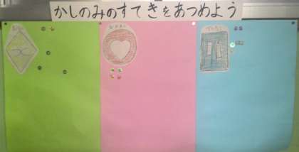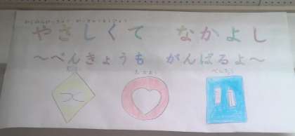 みんなで決めた学級目標「やさしくて なかよし 〜べんきょうもがんばるよ〜」にそって、6年生がかしのみマークを作ってくれました。手をつなぐ「協力マーク」、心をあらわす「やさしさマーク」、勉強道具が描かれた「勉強マーク」です。そのマークにぴったりのすてきなことをできたり見つけたりしたら、シールを貼って「すてきあつめ」もしています。