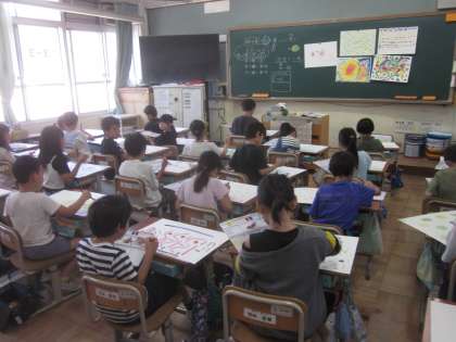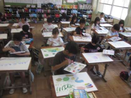 図画工作科の「絵の具+水+ふで=いいかんじ!」で3年生になって初めて、絵の具セットを使いました。色を混ぜて好きな色を作り、水を足して筆で描きました。模様を書いたり、色を塗ったりしました。「赤と青で紫になった」、「水を混ぜると、薄い綺麗な色になった」など、嬉しそうに話しながら活動できました。素敵な作品ができたので、教室に飾るのが楽しみです。