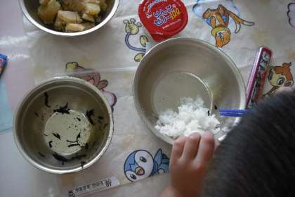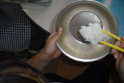 ごはんをお箸で寄せながらきれいに食べる食べ方を練習しました。少しずつ、「おいでおいで」と寄せながら食べました。こんなにきれいにぴっかぴかに食べることができて、子どもたちは自分でもびっくりしたようです。今日は、おかずもいつもよりきれいに食べきることができました。