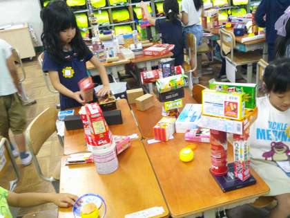 図画工作科「はこでつくったよ」では、おうちで集めた箱を積んだり、並べたりして、どんな形になるか、考えながら作りました。