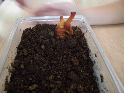 かしのみ学級で育てていたカブトムシの幼虫がさなぎになりました。