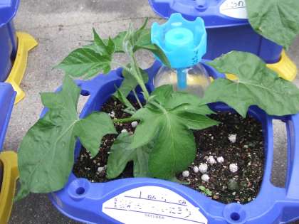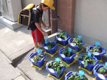 1年生が植木鉢にアサガオを育てています。毎朝,登校すると,自分のアサガオに水をやっている姿が見られます。アサガオは,本葉の数も増え青々と元気に育っています。子どもたちは,そのアサガオを見て,「大きくなった。」「つるが出そう」と,口々に話をしています。