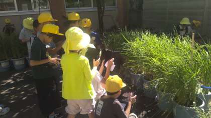 夏休みの間に大きく育った稲の観察をしました。写真を撮ってロイロノートに気づいたことをまとめました。夏休み前との違いに驚いている子どもたちでした。